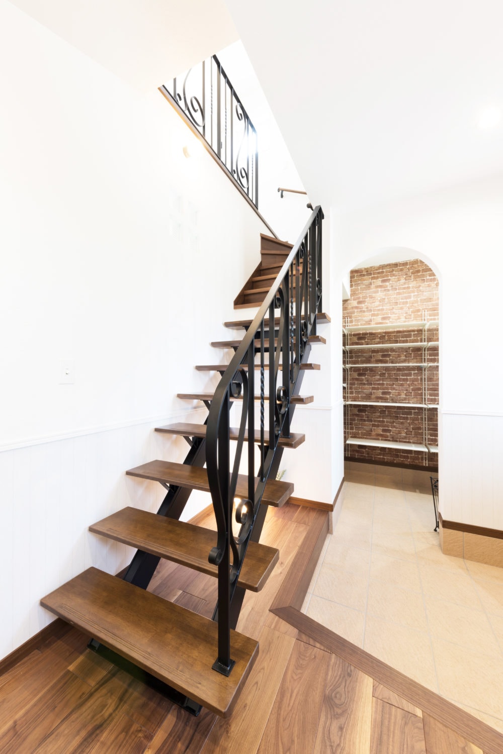 玄関奥のアーチ型の壁面は、たっぷりしまえる土間収納への入り口。可動棚式で好きな幅と高さに調節でき、置くモノに合わせて変えられるので効率的な収納ができます。床はタイルなので、外で使うベビーカーや、ゴルフ用品など多少汚れて帰ってくるものもそのままINして大丈夫なところも◎。